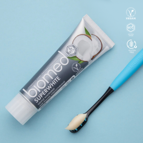 Biomed SUPERWHITE سوبر وايت، معجون الأسنان المبيض بزيت جوز الهند الطبيعي ومستخلص الأناناس لتبييض لطيف وسلس لمينا الأسنان الحساسة. والابتسامة السليمة البيضاء ستكون بمثابة بطاقة تعريف لك في عالم الأعمال!